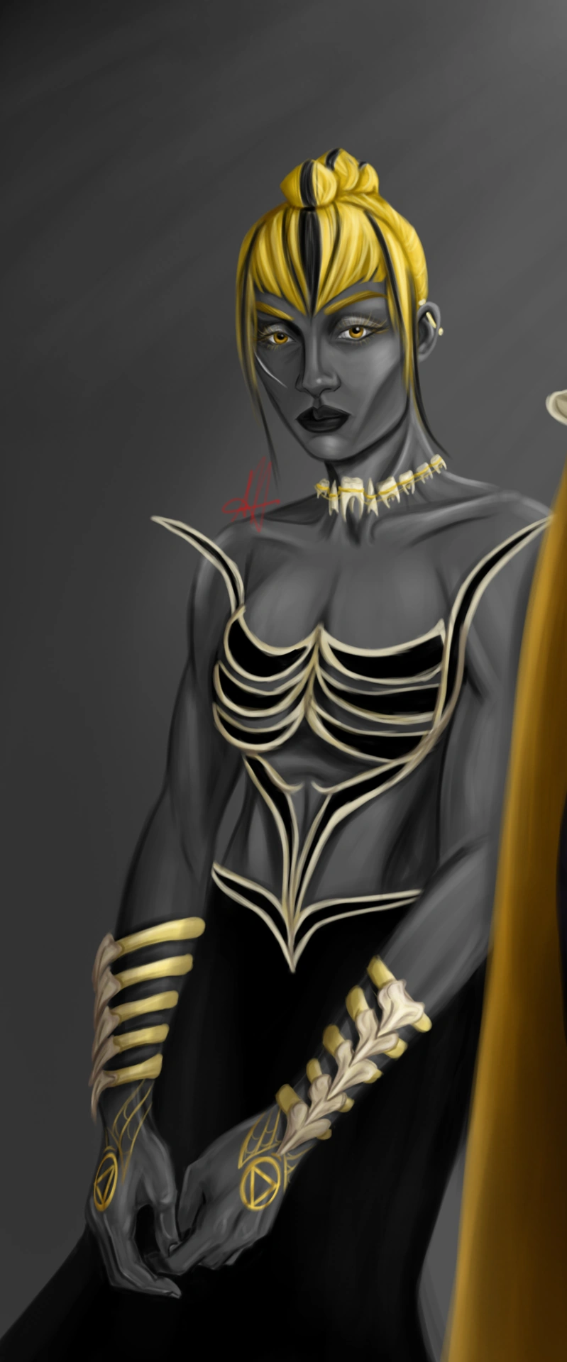 Anteriormente tenía cara de luna llena y unas mejillas marcadas por las sonrisas. Sin embargo, con su llegada al Instituto de Marte pasaron a ser mejillas demacradas, con quemaduras recientes y marcas. Se tiñó el pelo dorado de negro oscuro y se tejió huesos en las trenzas. Perdió varios dedos mientras estaba en el Instituto, aunque se desconoce si los reemplazó después.